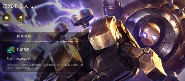 1、游戏里蒸汽机器人是一个2费棋子,然后自身有着机器人和斗士的羁绊,技能是机械飞爪,可以将距离最远的敌人控制拉到他的面前,将其眩晕一段时间,然后造成适量的魔法伤害;