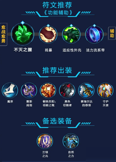 守护天使提高赛娜在后期团战中的容错率。在后期守护天使进入CD状态后,除了走位要更加小心之外,最好根据对面阵容选择更换一件防御装备,增加赛娜在团战中的生存能力。