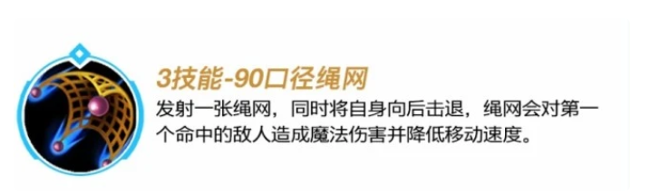 Q技能有一定的施法前摇,敌人近身时候用Q技能往往还不如直接普攻。3技能的反向推送可以用来越过一些小地形,但太宽的地形不行。搭配绳网的减速可以拉扯着消耗敌人。