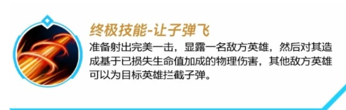 大招拥有超远距离锁定目标,如果目标的血量越少,则所造成的伤害也就越高。
