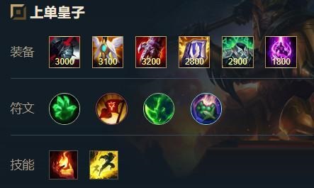 拿皇子打上路比较赖皮,第一件通常出幽梦,支援快,但黑切的减CD和护甲穿透比较香,有复活甲和血手的皇子很难死掉,鞋子出魔抗鞋加韧性。前期主Q消耗,团战就看自己理解了,最好不要先手eq上去,w减速后大招盖c位。这套cd有30%。天赋推荐不灭之握,有加生命值和回血,上路比较吃消耗。