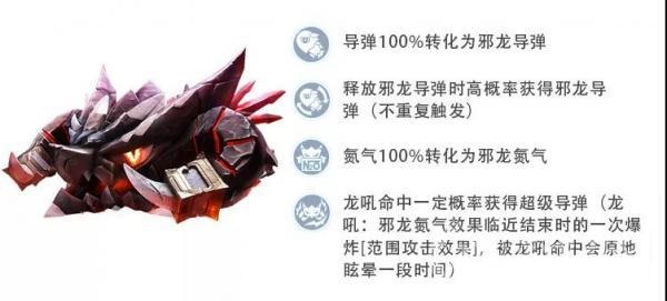 同时邪龙导弹还蕴含着鬼魅的力量,被邪龙导弹击中的敌人,不但会被轰飞至天,还会被邪龙的暗黑之力所侵蚀黑化。暗黑的魔龙幻影将实化遮挡受击者的视野,侵扰摧残受击者的心智。