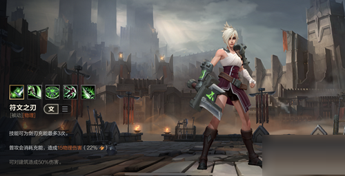 锐雯的技能能为剑刃充能,最多3次,而普攻会消耗充能,造成(15+22%攻击)物理伤害,这是锐雯的被动,在攻击建筑物时会削减为原来的50%。