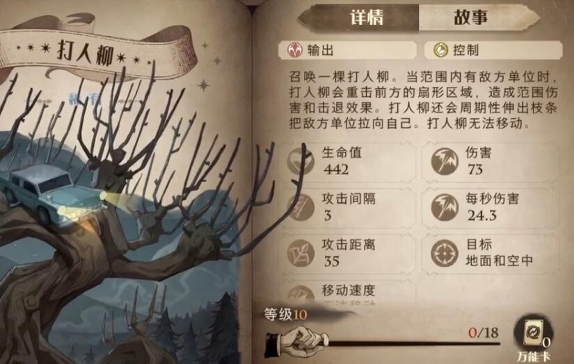 召唤一棵打人柳。当范围内有敌方单位时,打人柳会重击前方的扇形区域,造成范围伤害和击退效果。打人柳还会周期性伸出枝条把敌方单位拉向自己。打人柳无法移动。