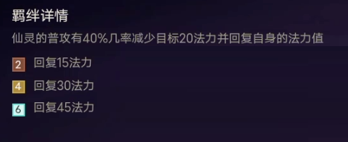 在降低敌方法力值的时候我方棋子还可以回蓝,如仙灵棋子中迅箭其法力值为0/75,正常无仙灵羁绊下需要普攻8次才能释放技能(一次普攻回复10点法力值),但如果在6仙灵羁绊下第一次普攻就触发了羁绊特效,就是直接回蓝45(仙灵羁绊回蓝)+10(普攻回蓝)=55法力值,还差20法力值就可释放技能,后面运气好第二次普攻也触发仙灵特效那么直接就可满蓝释放技能。