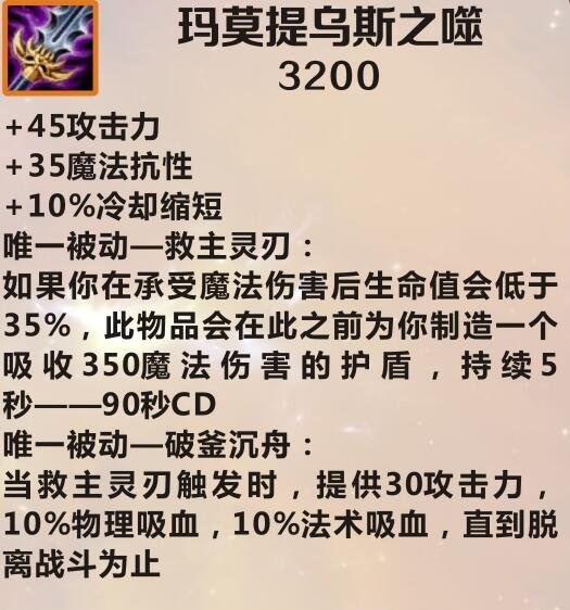 当救主灵刃触发时,提供30攻击力10%物理吸血,10%法术吸血,直到脱离战斗为止