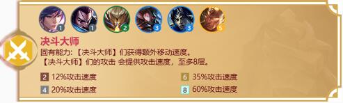 固有能力: [决斗大师]们获得额外移动速度。[决斗大师]们的攻击会提供攻击速度,至多8层。