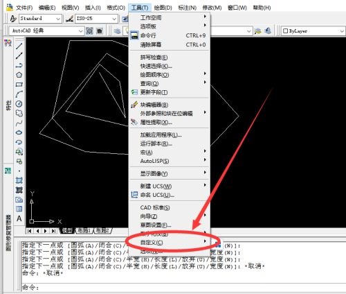 第二步:在CAD菜单栏【工具】下拉菜单中选择【自定义】并点击打开(如图所示)。