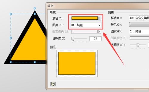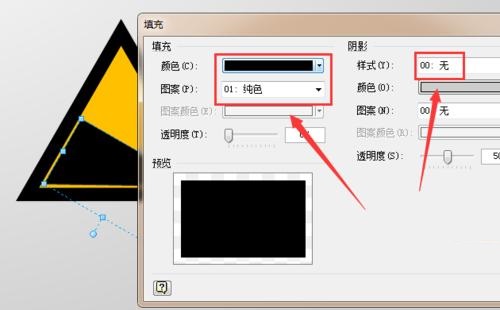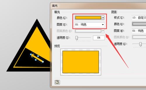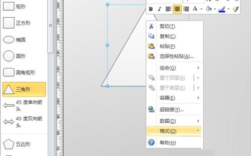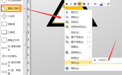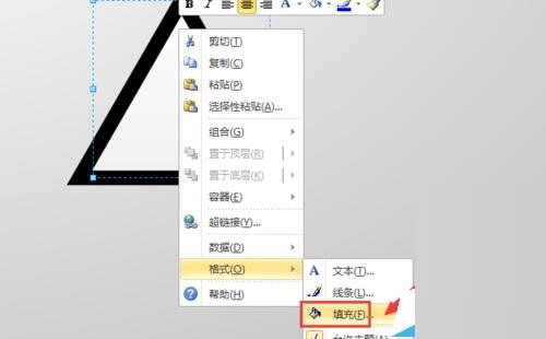 第五步:再从左侧拖入一个“直角三角形”,调整其位置和大小,并单击鼠标右键,选择“格式”-“填充”选项,将其填充属性设置为“纯黑色,无阴影”,如图所示