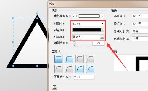 第三步:单击鼠标右键,选择“格式”-“线条”选项,将其线条属性设置为“纯黑色,12pt”,如图所示。