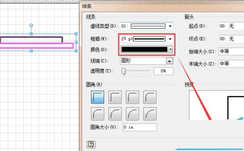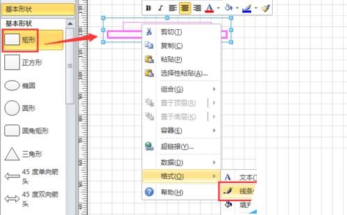 第二步:将左侧“矩形”图案拖入右侧编辑栏,并调整其大小和形状至如图所示的样式,同时选中两个矩形,单击鼠标右键,选择“格式”-“线条”选项,将其线条调整为黑色。