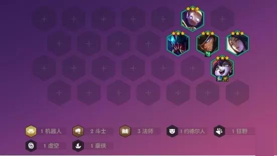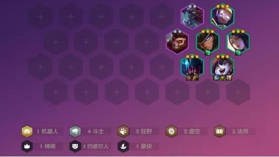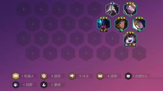 阵容组成:虚空恐惧-科加斯(4)、蒸汽机器人-布里茨(2)、齐天大圣-孙悟空(4)、命运之手-卡牌大师(2)、青丘灵狐-九尾狐妖(2)、虚空遁地兽-雷克塞(2)、仙灵女巫-露露(2)