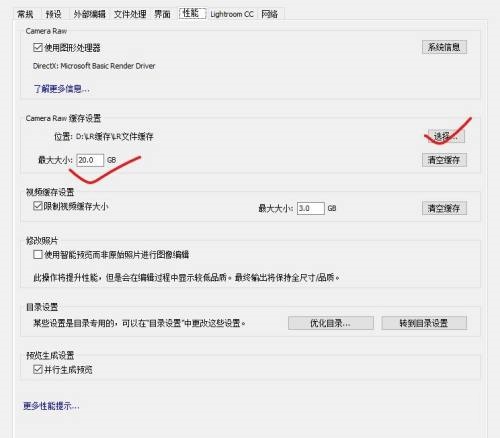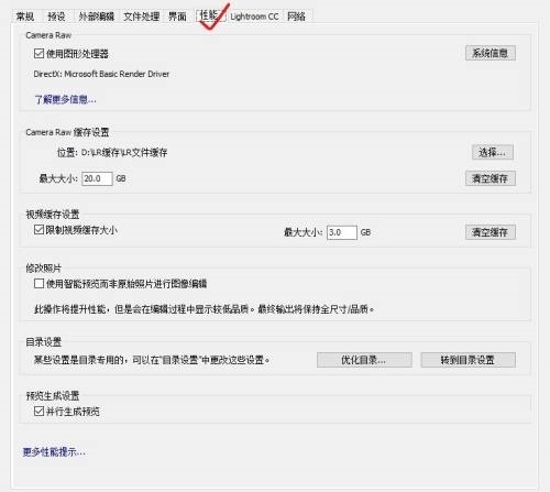 第三步:在“性能”选项卡中间找到“Camera Raw”选择框,修改路径(如图所示)。