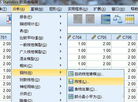 第二步:分析——回归——线性(如图所示)。