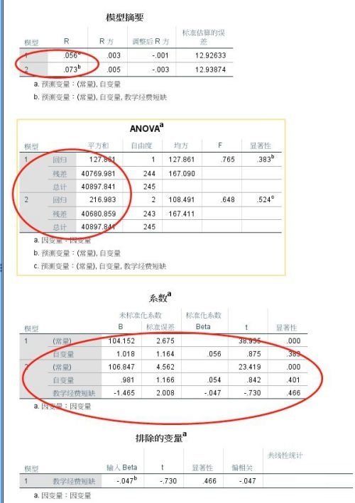 第六步:结果都会有两个模型,可以对比控制变量放进来之后的各指标变化,一般看R放和系数表(如图所示)。