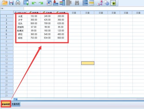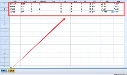 第一步:双击打开SPSS分析工具,切换到变量视图,添加四个变量(材料分类、销售量、采购量和消耗量)(如图所示)。