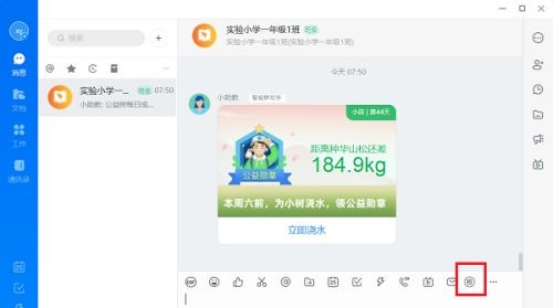 第一步:电脑上打开钉钉,进去班级群,点击校的图标,如下图所示: