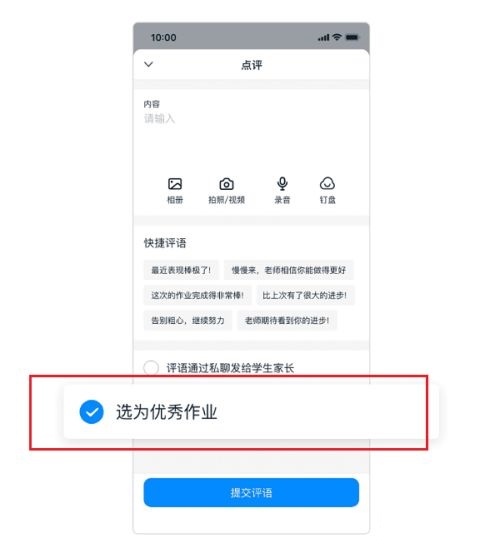 第五步:批改作业的时候,也可以将作业点评为优秀作业,如下图所示:
