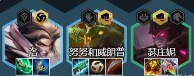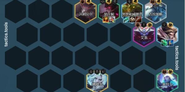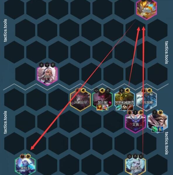 阵容的站位非常简单,3星努努直接对位对面的主C位置即可,除非是带有巨人捕手的破败德莱文能够快速带走努努,否则其他人基本都是充电宝。后期如果瑟提没有3星替换狗熊,狗熊的站位也是根据对面的主C站位,洛只要站在斗士后排恢复血量即可。