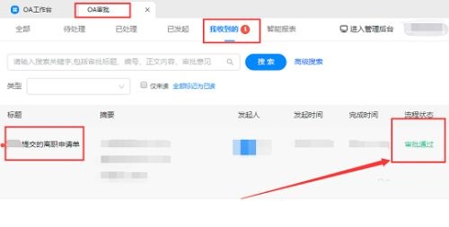 第六步:审批通过后,可以在“OA工作台”中打开“OA审批”,在"我收到的"中查看审批状态(如图所示)。