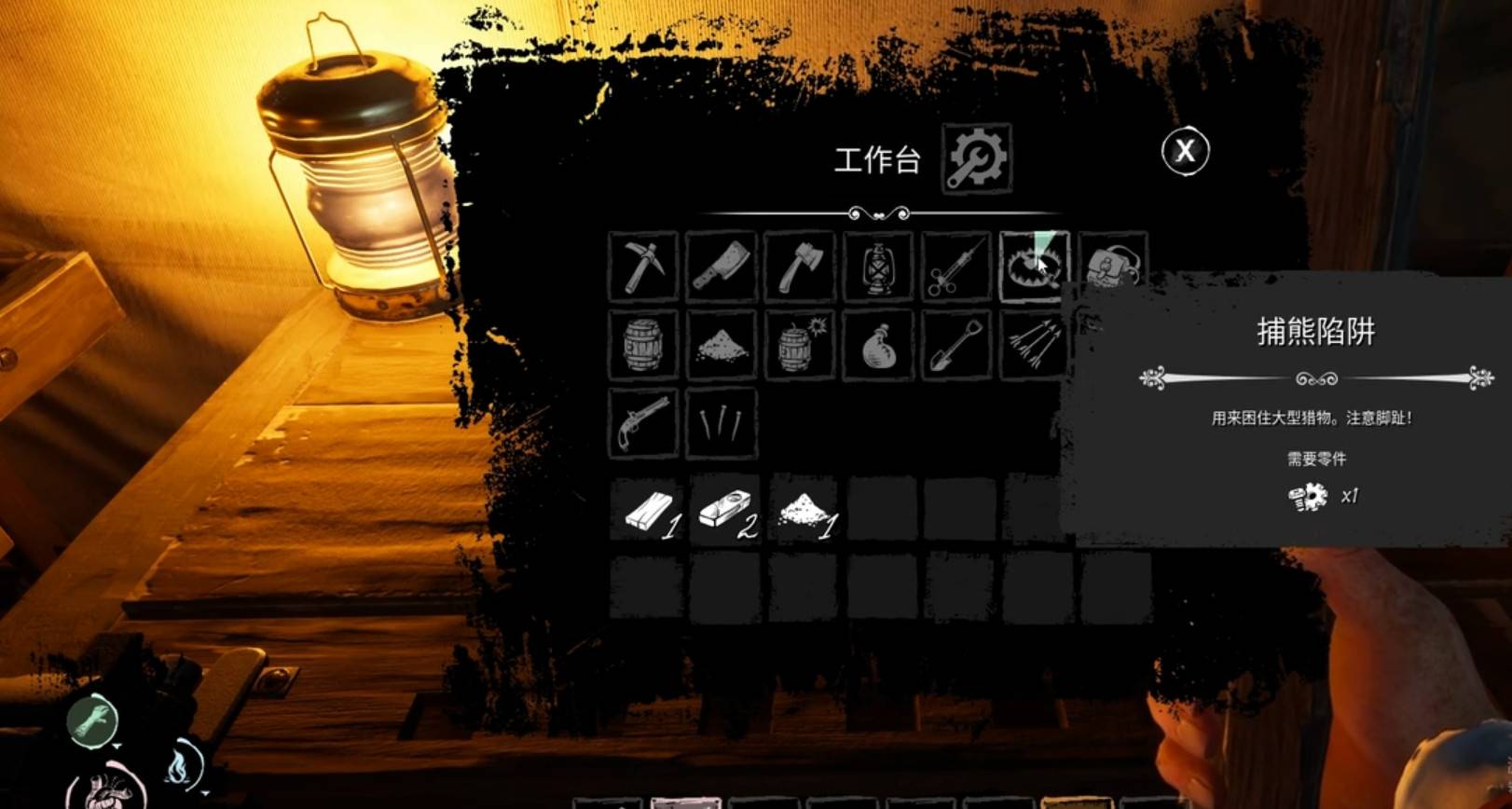 7.去外面搜刮一番后,我们把菜刀,捕兽,陷阱,弹药和其他各种装备都制作出来。