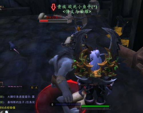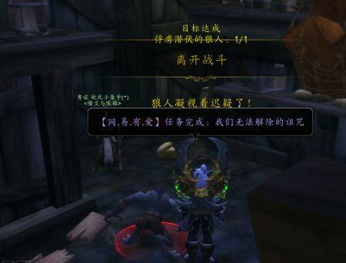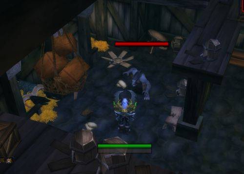 3、进去屋子中间之后,二楼会跳下来一只狼人把你扑倒。如果你是大号,不要攻击这个狼人,因为攻击这个狼人是直接秒的。让你二三十级左右的小伙伴将它慢慢打到残血。