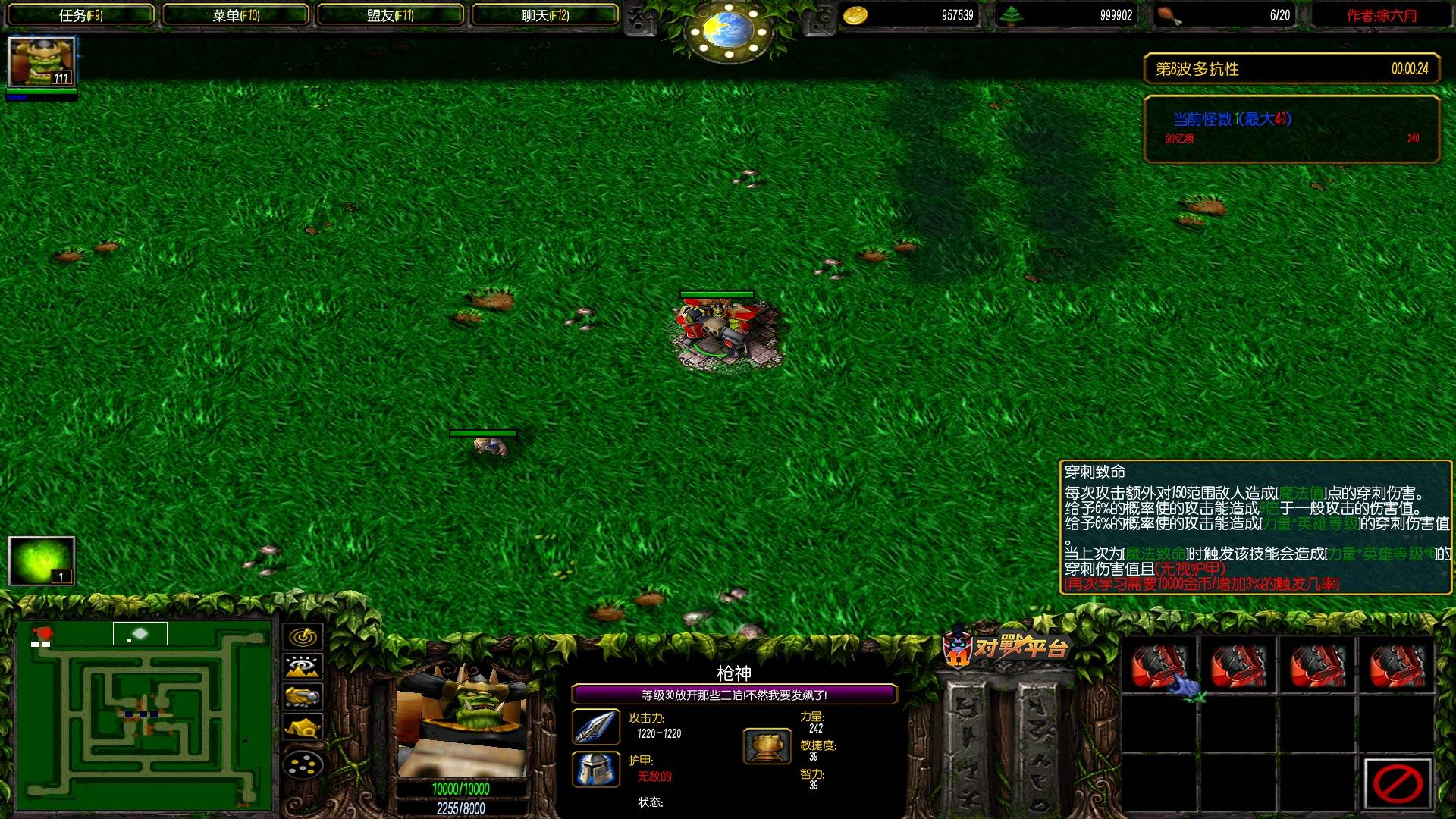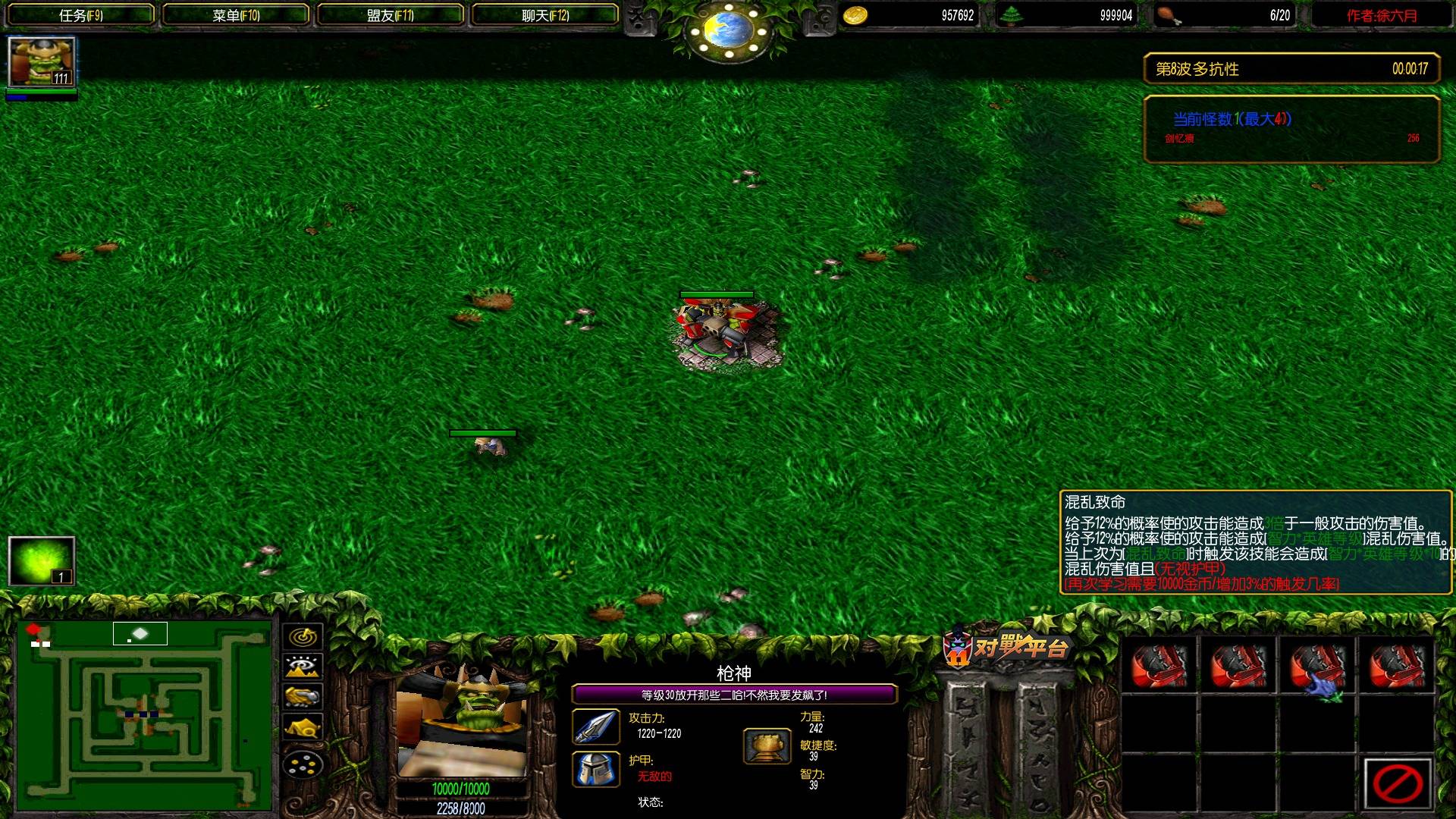 3、三技能混乱致命:3个效果,概率枪神普攻暴击(抢神身边飘红数字),具体伤害=攻击力的3倍。触发范围混乱伤害(枪神身边飘红色字:混乱 数字),具体伤害=智力*英雄等级。当上次触发的本技能的2效果混乱致命且当前触发本技能的2效果、混乱致命将得到加强,具体伤害为智力*英雄等级*10且无视护甲(彩色字:混乱 数字)。可以消耗1000金币再次学习,23触发几率 3%
