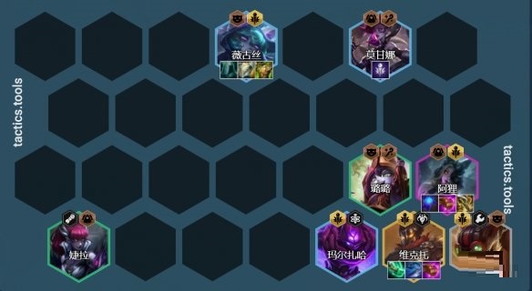 中期阵容:4-1拉7人口,如果前期经济好的情况下可以选择在3-6拉7人口,但是核心还是要找到2星马尔扎哈,否则中期根本无法过渡。如果有黑魔海克斯强化,那么直接开6黑魔,没有则补充莫甘娜开2白魔,名流羁绊在前排给薇古丝,后排给蚂蚱。