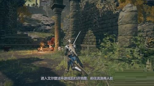 1、进入艾尔登法环游戏后打开地图,前往流浪商人处。