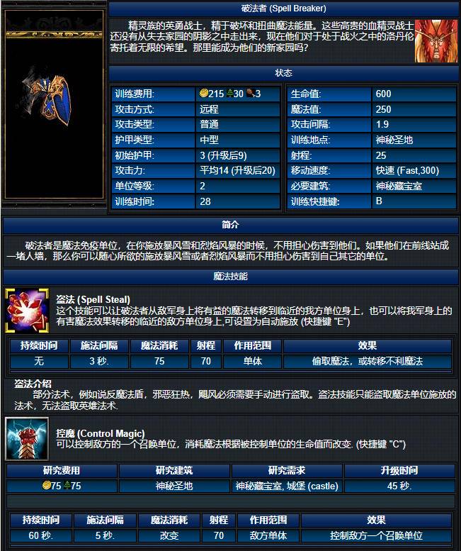 在【War3 冰封王座】游戏中,人族的【破法者】作为人族的中后期单位拥有不俗的战力以及非常实用的技能。【破法者】本身是【魔法免疫】的,对付其他族的法师有优势。另外【破法者】拥有【魔法盗取】技能,把别人身上的【增益BUFF】偷到自己人身上。因为人族三本科技出【骑士】太慢,所以【破法者】在升攻防之后也可以当个【肉盾】顶在前面。下图为【破法者】兵种属性。