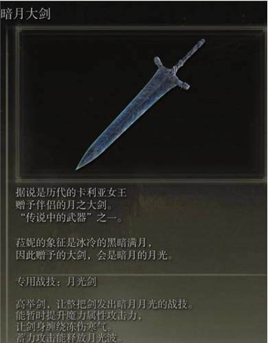 2、暗月大剑:完成魔法师菈妮全部支线后即可获得。