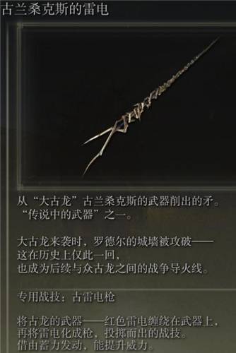 5、古兰桑克斯的雷电:在王城打败初始之王葛孚雷的化身后,可以激活黄金树大教堂赐福点,从赐福点西门跑出坐电梯下来,出电梯即可看见紫色的可收集点,从黄金树边栏杆跳下在沿着上去即可。(PS:把王城烧了之后就没了。)