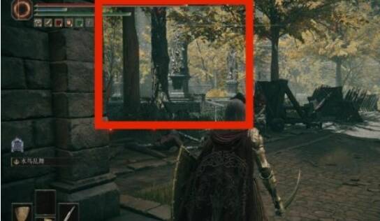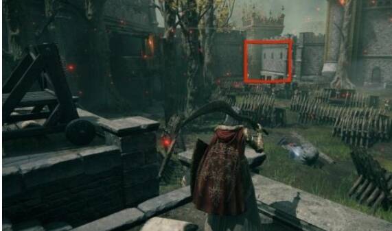 3、到达下图位置,并向红标处进发并走到尽头,此时会看到一个桥,桥上有三个巨人,可以无视他们。