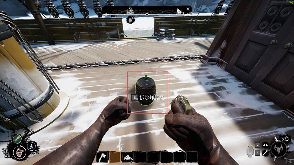 2.然后,制作完炸药桶后回到船上,将炸药桶拿在手中点击鼠标左键点燃再点击F键丢出,炸药桶爆炸后便成功炸船。