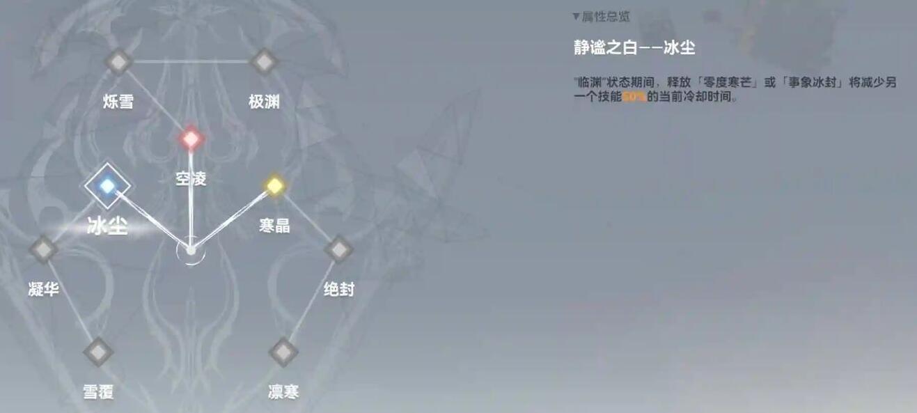 【冰尘】临渊期间,释放【零度寒芒】或【事象冰封】,将减少另一个技能50%的cd。加快了临渊期间的技能释放频率(可以多吃专属buff),变相提高了伤害。