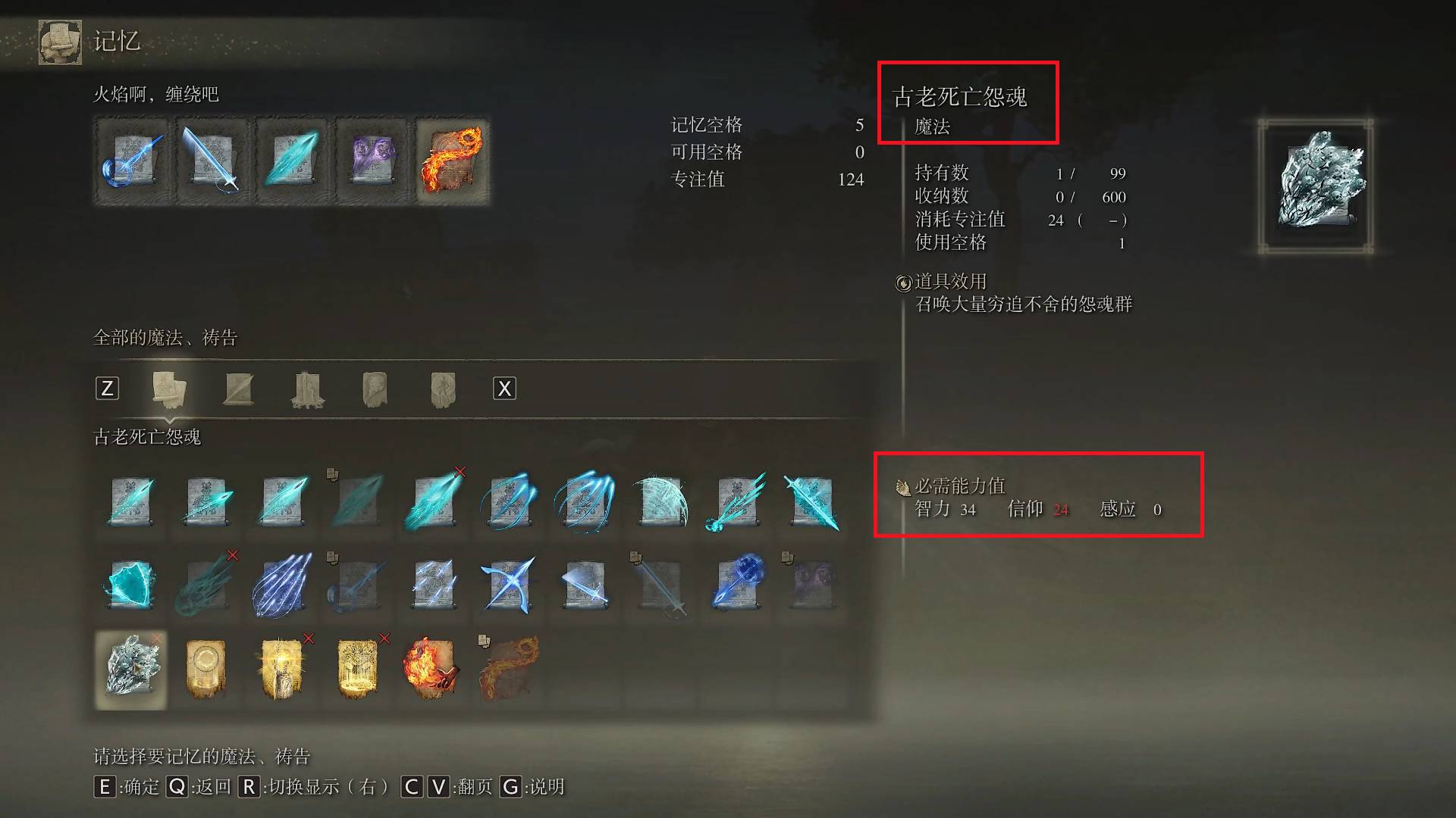 在艾尔登法环游戏中,古老死亡怨魂魔法必需能力值是智力34、信仰24、感应0。