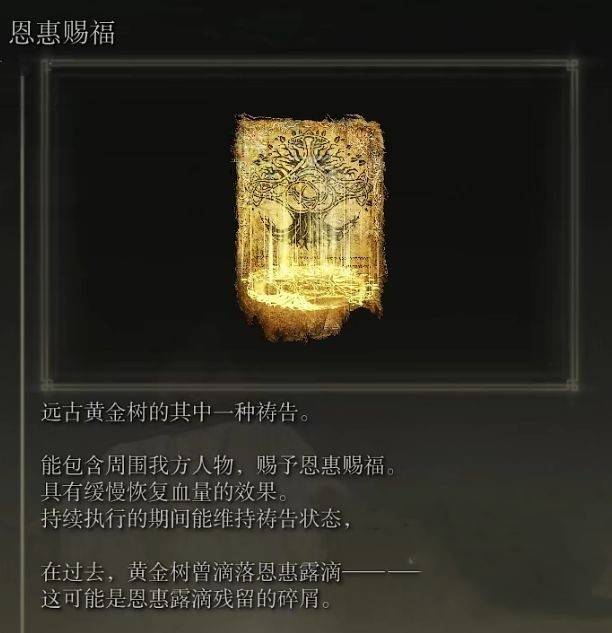也就是说,无上意志本不属于交界地势力,来到交界地后制造出黄金树,并推出领导人玛丽卡。玛丽卡及其背后的无上意志通过艾尔登之环,得到了控制生命熔炉,控制黄金树的权利。然后通过赐福控制着交界地。从下图恩惠赐福的简介可以看出。