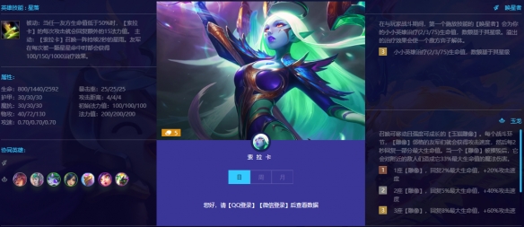 被动:当任一友方生命值低于50%时,【索拉卡】的每次攻击就会回复额外的15法力值。 主动:【索拉卡】召唤一阵持续2秒的星雨。友军在每次被一颗星星命中时都会获得100/150/1000治疗效果。属性:生命:800/1440/2592暴击率:25/25/25