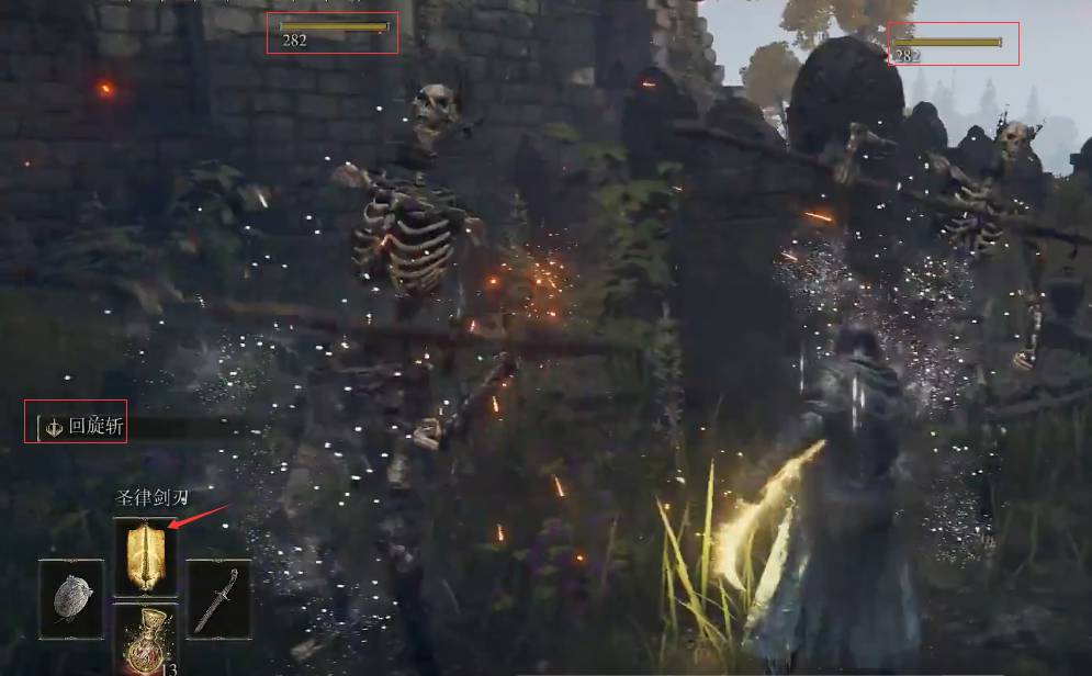“圣律剑刃”能增加“山贼弯刀”的圣属性攻击,再加上自身战技的物理攻击,一刀解决两个人骨怪,伤害不凡,如下图中的展示。