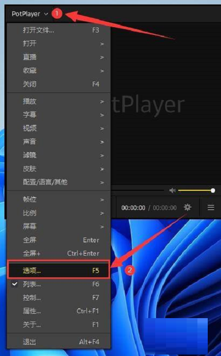 第二步:打开PotPlayer主界面后,点击左上角“菜单”按钮(PotPlayer右侧下拉图标),在下拉列表中点击“选项”进入。