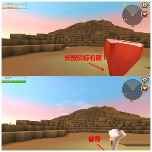 2、拿着食物长按鼠标右键进食,肘子被吃掉后得到兽骨。