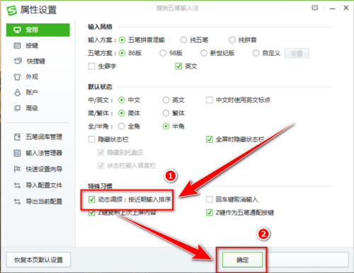 第四步:在常用设置页中,取消勾选“动态调频:按近期输入排序”,即可关闭动态调频。