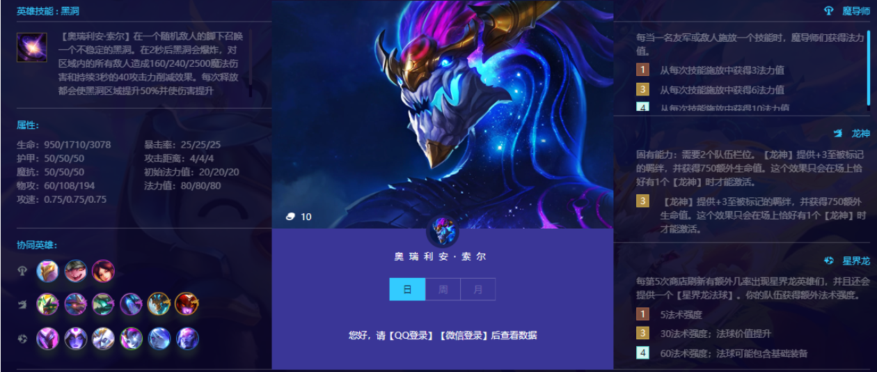【奥瑞利安·索尔】在一个随机敌人的脚下召唤一个不稳定的黑洞。在2秒后黑洞会爆炸,对区域内的所有敌人造成160/240/2500魔法伤害和持续3秒的40攻击力削减效果。每次释放都会使黑洞区域提升50%并使伤害提升160/240/2500。属性:生命:950/1710/3078暴击率:25/25/25