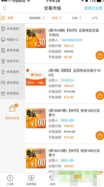 交易市场:如果用户中了不需要的商品,可以在交易市场出售;同时,也可以在交易市场购买别人出售的商品。商品出售平均10秒内完成交易,再也不用担心商品积压。