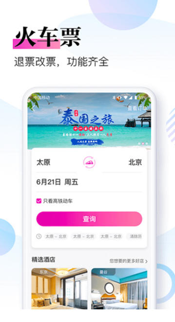 火车票预订:支持国内火车票预订、在线抢票、在线选座、在线退改签等特色服务,全国列车时刻及余位实时查询,全方位保障用户的铁路出行。