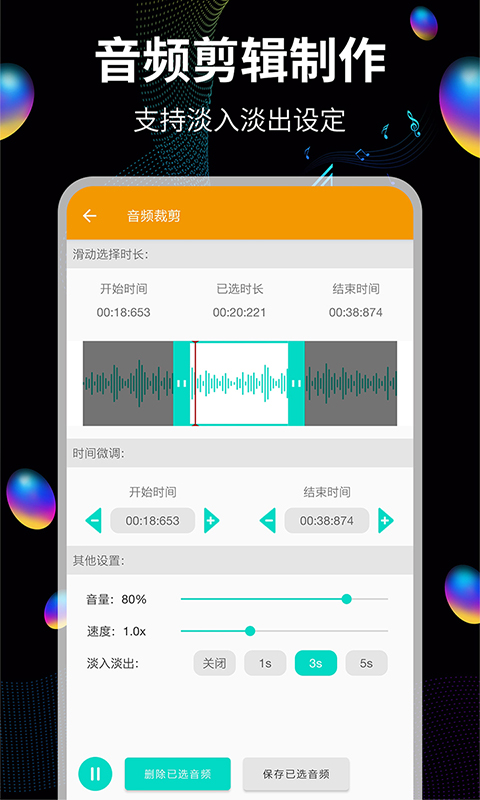 【音频剪辑】 音频裁剪功能,支持从音频中截取选中的一段喜欢的部分生成一个新的音频文件,也可以删除不想要的部分,支持手动设置截取的开始和结束时间,一键保存,即可制作自己心爱的歌曲作为手机铃声。