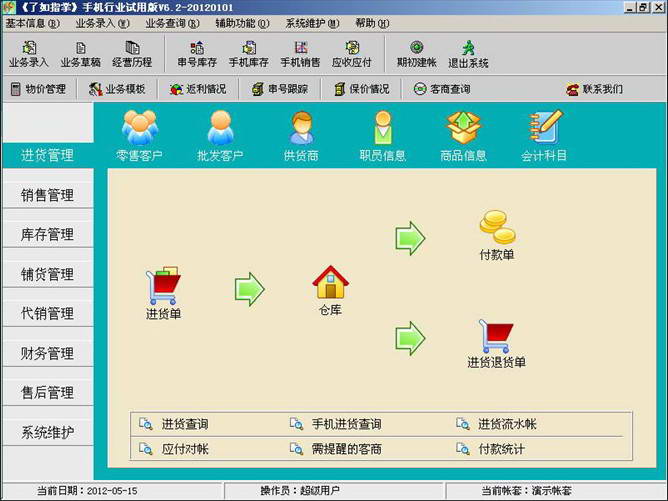 软件简介:了如指掌【手机店】管理软件是针对手机销售企业开发的业务管理软件,它可帮助手机销售企业掌握客户资料及经营过程中产生的各种业务数据,如:铺货情况,串号跟踪,保价情况,返利情况,库存情况,销售情况,进货情况,应收应付情况,财务情况等等,最终提升企业的经营管理水平和竞争力。以下是对软件的一个简单介绍: