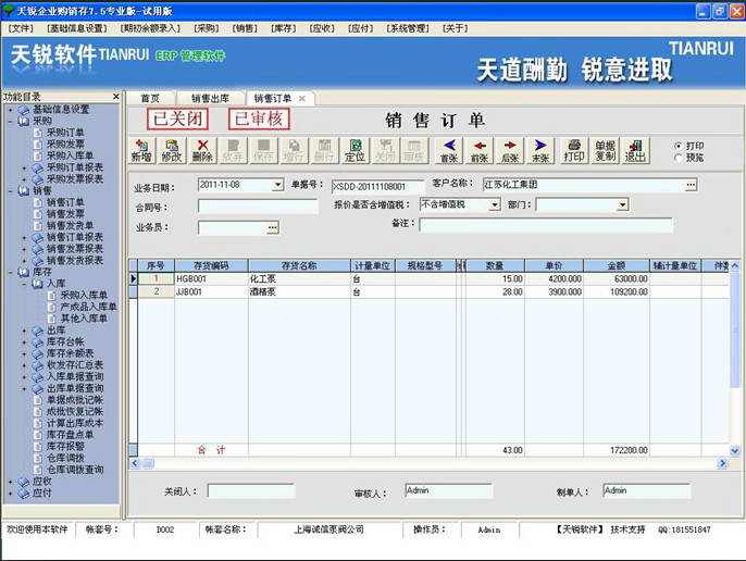 8.界面:主界面采用多文档方式设置:即可以同时打开多个子菜单。不象市场上的进销存软件,如果现在打开的是销售订单,想要进入销售发货单,那么要先关闭销售订单,才能进入销售发货单。本软件可以同时打开任意多个功能区。