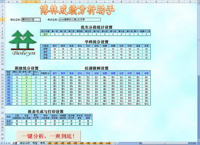 大凡考试之事,教导主任们都要用Microsoft Office Excel来随机生成考号,登录成绩并生成各种报表,但手工操作都很烦琐,并容易出错。为此,我室就以教导主任们最为熟悉的Microsoft Office Excel 2003作为表现形式来进行开发,把绝大部分考务工作都融入到了“博林成绩分析助手”之中,具有简单易用、修改灵活、分析深入等特点。特色按钮“一键分析,一爽到底”,只须弹指功夫,便可生成和打印你需要的所有报表,实现一爽到底。