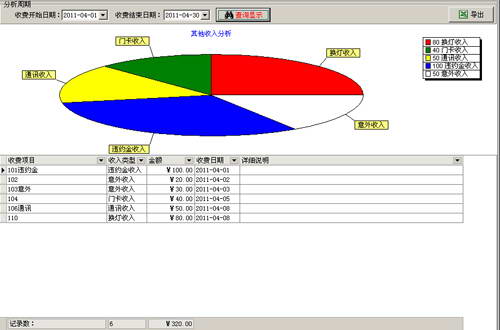 13、系统设有强大的统计功能,包括:月收费报表、日收费报表、其他费用统计、收支明细帐等等,月收费报表可以充分体现每月的应收、实收、欠费等等情况。收支明细帐相当财务流水帐,只要跟钱有关系的数据均在这里可以进行查看,方便领导层进行费用核对。